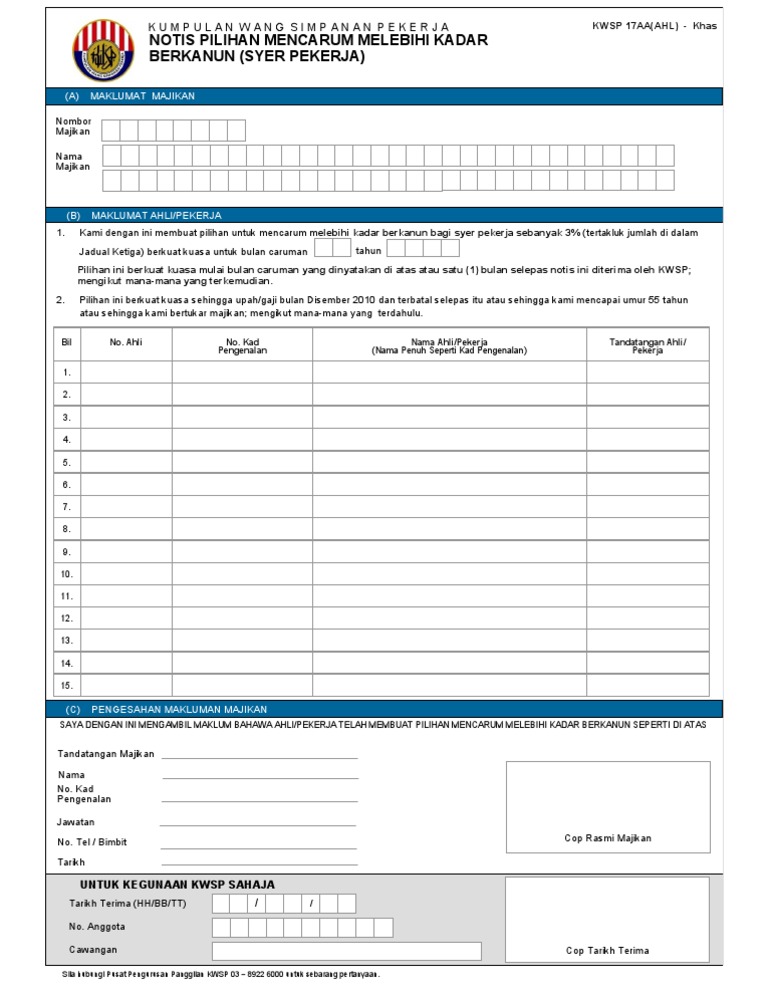KWSP 17AAHL - Khas KUMPULAN WANG SIMPANAN PEKERJA NOTIS PILIHAN MENCARUM MELEBIHI KADAR BERKANUN. K U M P U L A N W A N G S I M P A N A N P E K E R J A NOTIS PILIHAN MENCARUM MELEBIHI KADAR BERKANUN SYER PEKERJA Nombor Majikan BIL NO. Ahli yang ingin mencarum melebihi kadar berkanun 11 peratus atau 55 peratus boleh mengemukakan borang kwsp 17a ahl atau borang kwsp 17aa ahl.